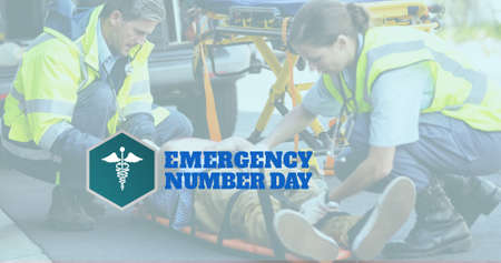 Digital composite image of caucasian paramedics helping man with emergency number day text. Copy space, emergency assistance, public safety answering point, universal emergency number.