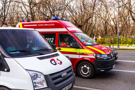 Ambulance stuck in traffic in downtown area of Bucharest. Car pollution, traffic jam in the morning and evening in the capital city of Bucharest, Romania, 2020