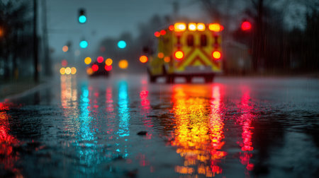 Nighttime urban scene showcasing a gleaming emergency vehicle moving down a city street during a rainfall. Bright emergency lights illuminate the vehicle.