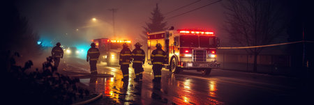 Fire Trucks and Firefighters in Action at Night