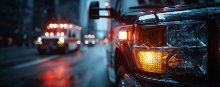 Emergency vehicle light on damaged car headlight with ambulance and city street in background at night