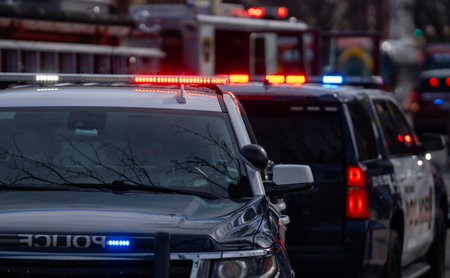 City crime scene with flashing police lights emergency vehicle at accident. Concept Emergency Response, Crime Scene Investigation, Police Lights, Accident Scene, City Scene