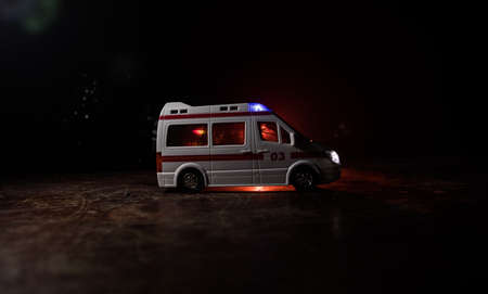 Corona virus concept with Ambulance car. Stay home for precautionary measures to prevent from corona virus. Ambulance car on dark misty background. Creative artwork decoration. Selective focus