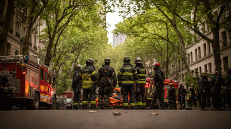 Firefighters and an ambulance in a city setting during sunset, highlighting emergency response and urban life