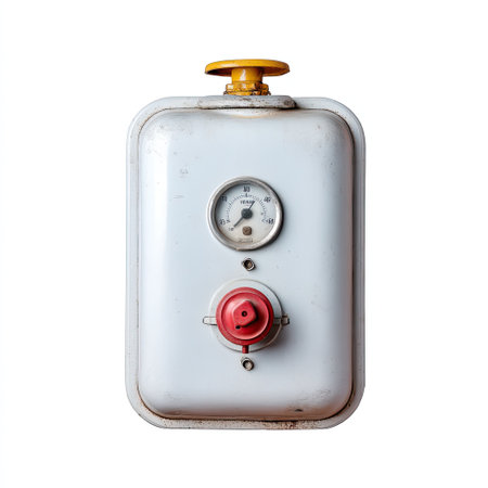 A vintage gas meter featuring a pressure gauge and a distinctive red valve handle. This unique piece embodies retro industrial design, perfect for home decor or utility themes.