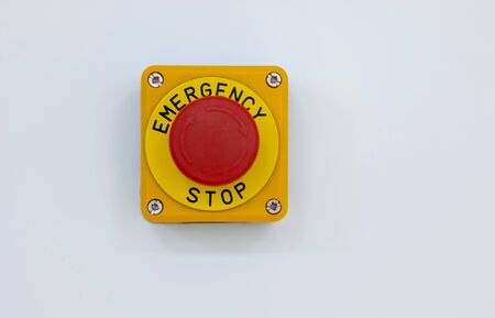 Emergrncy stop button on white wall ,use for emergency stop the machine or process in manufacturing.