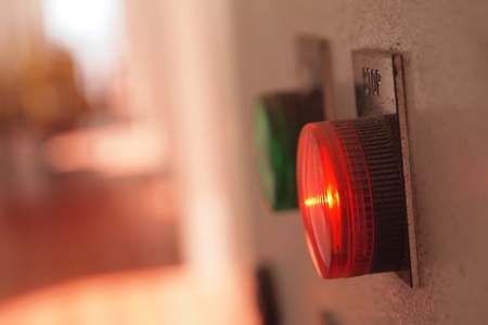 close-up of emergency button and red light button on gray steel background