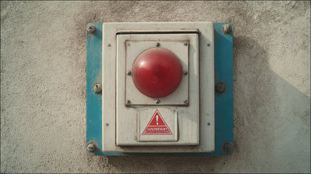 This image features a prominent red emergency button mounted on a wall, accompanied by a warning sign indicating its purpose for safety alerts and responses.