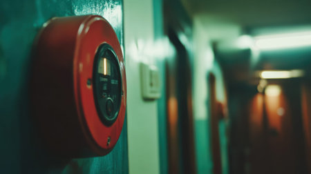 A close-up of a red fire alarm mounted on a wall in a dimly lit hallway, emphasizing its role in emergency situations for safety and security in buildings.