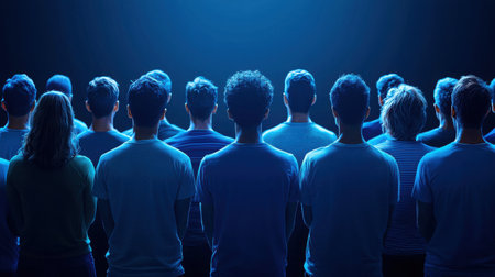 A striking image featuring a diverse group of individuals standing together, illuminated by soft blue light. The back view captures a sense of unity and contemplation.