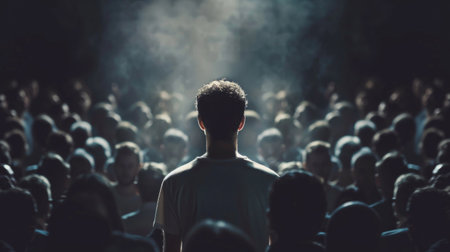 Dark silhouettes of a crowd highlighted by a concentrated light source, symbolizing human presence, collective behavior, and social psychology themes.