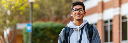 A cheerful Hispanic male student is standing in the front yard of his high school.