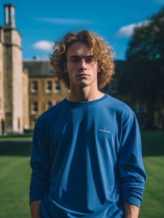 Serious young caucasian guy filming himself on camera outdoors during day Curly blonde hair male wearing shirt over tshirt Concept self shooting : Generative AI