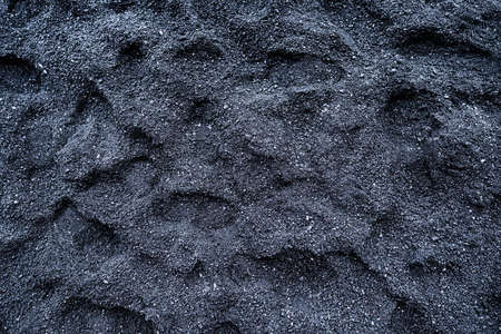 Black sand as a background. Photo for the design. Footprints in the sand. Textures in nature.