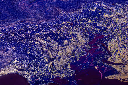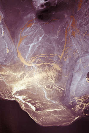 Acrylic Fluid Art. Luxury Purple Waves Pattern with Gold sparkles. Abstract space background or texture.