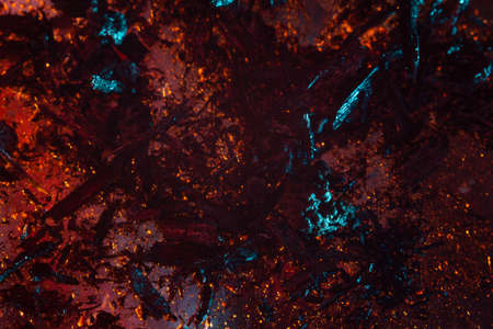 coals scatter in different directions with a blue-orange backlight on a dark background. close up copy space
