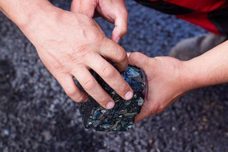 Miner dirty hands holding piece of fossil lignite coal mine