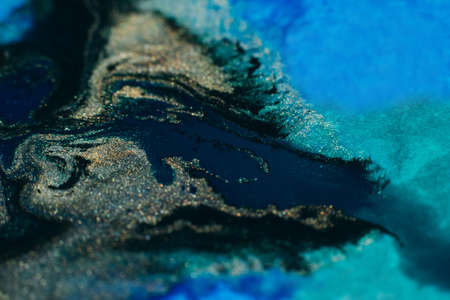 Mixed paints art. Abstract design background. Blue gold black glitter ink blend