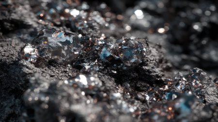 This stunning close-up image showcases sparkling crystals perched on a dark rock surface, highlighting intricate textures and reflections.