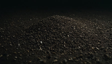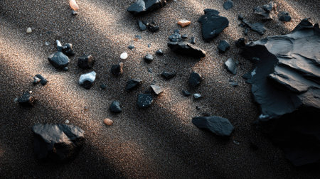 Scattered bits of black volcanic rock across sand-toned surface with high contrast lighting