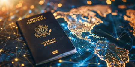 A passport is on a map of the world. The passport is from the United States. The map is lit up with a blue and yellow color scheme