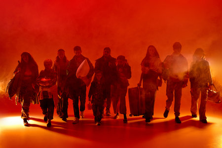 Tired migrants walking slowly under red neon glow through smoke, the looks exhausted and confused. Concept of humanitarian crisis, displacement