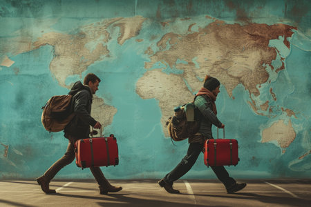 Dynamic image of a traveler exploring a world map filled with different objects, awakening wanderlust. Generative AI