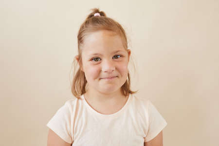 Closeup portrait of preteen beautiful blond hair girl in light room with blurred background. Female kid schoolgirl looking at the camera and smiling indoors