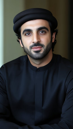 Portrait of a Confident Middle Eastern Man in Traditional Black Attire with Neutral Background