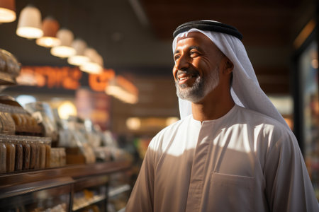A captivating photograph ideal for cultural features, diversity campaigns, or as a respectful representation of Middle Eastern heritage | This image exudes warmth and friendliness, focusing on a man dressed in traditional Middle Eastern clothing, his smile exuding hospitality and openness. The impeccable white of his allure contrasts effectively against the blurred background of a modern, well-lit space, symbolizing the harmonious blend of tradition and modernity. The subject's smile and engaging eyes are sharp in detail, conveying a sense of genuine welcome that transcends cultural boundaries. His allure, characterized by a kandura and a neatly wrapped ghutra held in place by an equal, represents cultural identity and regional pride. The light cascading over the scene highlights its features, enhancing the texture of the fabric and the authenticity of the moment | Suitable for inclusion in travel brochures emphasizing cultural experiences, educational material about global attraction, or as a positive and inclusive image in corporate diversity and inclusion materials. The photograph could also be used by tourism boards or in a personal setting, serving as inviting wall art that reflects cultural richness and intercultural dialogue | a high-resolution photo of a smiling man in Middle Eastern dress, sharply focused against a soft-focus background, offering a narrative of cultural celebration under warm indoor lighting, ideal for overlaying text for articles or headlines