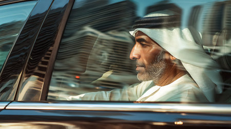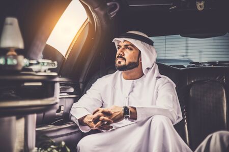 Handsome man with uae traditional outfit driving in Dubai. Middle eastern man with kandura in the car
