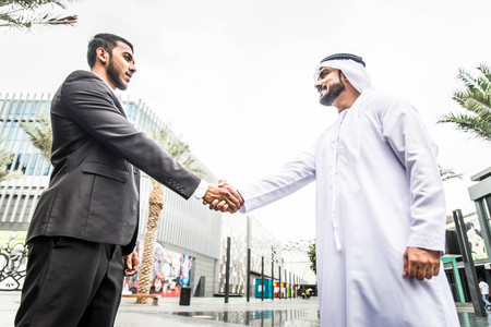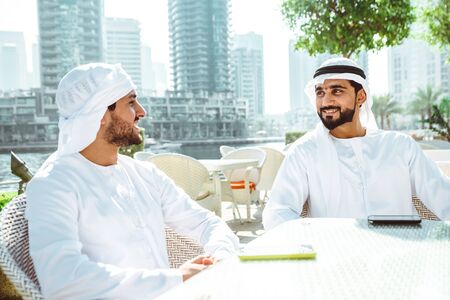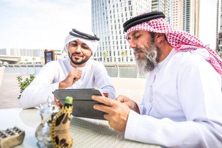 Two businessmen with traditional emirates clothes meeting in Dubai - Senior and young adults having business in the UAE