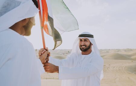Business men wearing traditional uae white kandura spending time in the desert of Dubai.