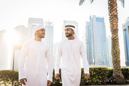 Middle-eastern young adults wearing kandora walking outdoors in Dubai - Two businessmen meeting outdoors