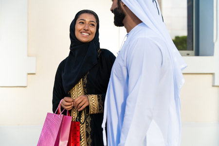 Traditional arab couple wearing emirati clothing - Middle-eastern married woman with abaya and man with kandura meeting and having fun in the city
