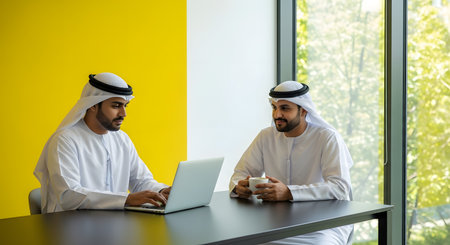 Two Emirati men in traditional dress collaborate on a laptop in a bright, modern office, symbolizing business and technology.