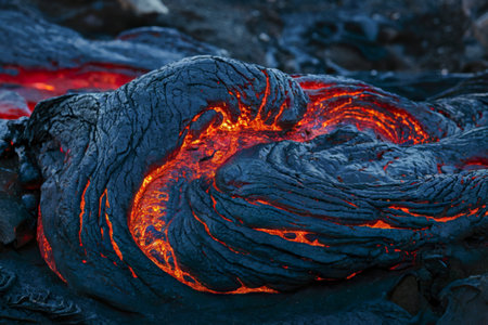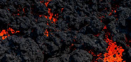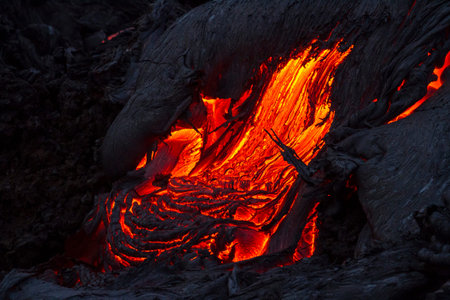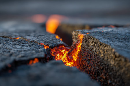 Detailed view of an active lava flow, hot magma emerges from a crack in the earth, the glowing lava appears in strong yellows and reds. lava ocean entry in the morning.