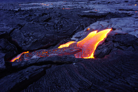 Hot magma of an active lava flow over old lava field, the lava cools slowly and solidifies, Kilauea, Big Island, Hawaii