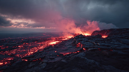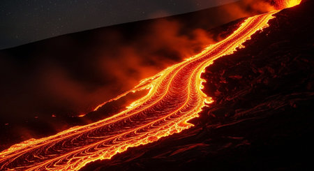 Fiery volcanic eruption with lava flows at night. Concept of active volcano, natural disaster, geological phenomenon, extreme environment.