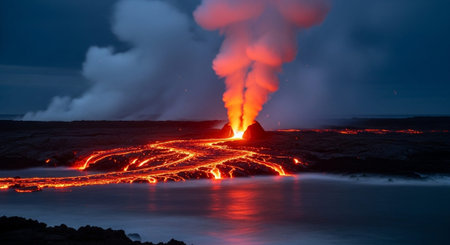 Volcanic eruption meeting ocean, showcasing fiery contrast