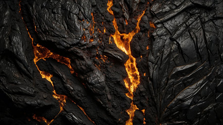 Abstract landscape of fiery lava flowing across dark terrain