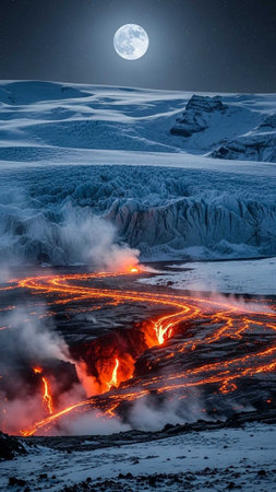 Molten lava flows through icy terrain under a full moon.
