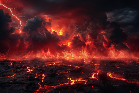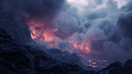 Volcanic eruption with lava and ash, fiery landscape image