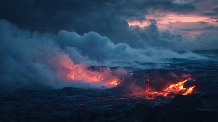 Fiery molten flow radiates intense light through jagged, shadowed volcanic fractures during dusk, capturing the raw power and vivid glow of Earth's restless interior.