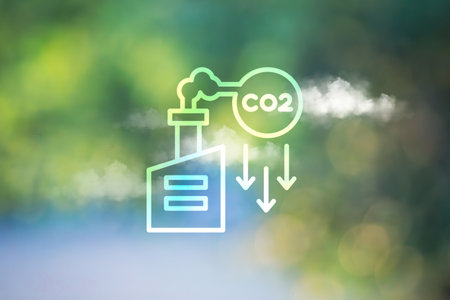A magnifying glass highlights the concept of CO2 reduction, focusing on industrial pollution with factories emitting smoke against a serene backdrop.