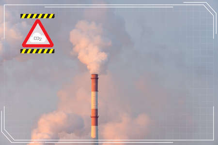 Emission to atmosphere of factory smoke pipes with virtual of digital icon of carbone gases. Smokestack pipes with design infographics. Industry chimney pollute the air