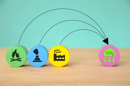 The arrangement of the blocks representing fire, volcano, factory, and CO2 emissions symbolizes the interconnectedness of human activities and their impact on the environment.