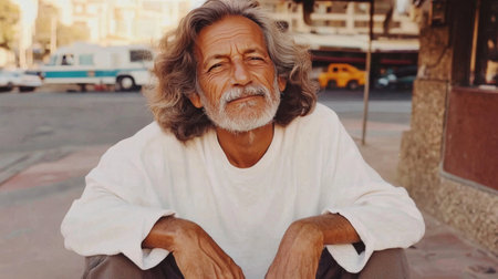 Man with long hair and beard smiles in a lively ancient marketplace, surrounded by others, capturing the essence of community and shared experiences