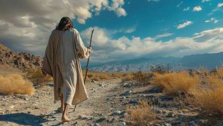 Man in white robe walking on a dirt road with a staff, mountains in the background, Jesus, faith, christianity, hope, pilgrimage