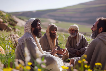 In serene tableau, Jesus Christ and disciples gather, radiating divine harmony. Scene captures essence of spiritual teachings and the sacred camaraderie among these central figures of Christian faith